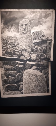 obscur. Les figures émergent de zones sombres, les volumes se construisent par contraste et par effacement, la lumière plus douce ne sert pas à révéler une vérité mais accompagne une perception incertaine parfois fragmentée, des formes et des espaces. « L’artiste ne documente pas : il travaille à partir d’images existantes, paysages, figures et motifs issus notamment de cartes postales qu’il reprend, déplace et réagence. Le Dessin n’est pas ici un espace de reproduction mais de construction d’un récit où des éléments reconnaissables coexistent sans jamais s’ajuster pleinement. La présence du minéral, montagne, roches ou ruines structure l’ensemble dans lequel les figures humaines s’inscrivent difficilement, fragiles, de passage, souvent isolées, en tension, elles semblent moins agir qu’endurer.» explique Jean-Joseph Renucci. Cette relation à la matière engage le Dessin lui-même. L’artiste applique la pierre noire broyée sur du carton gris, un rapport allégorique au minéral.