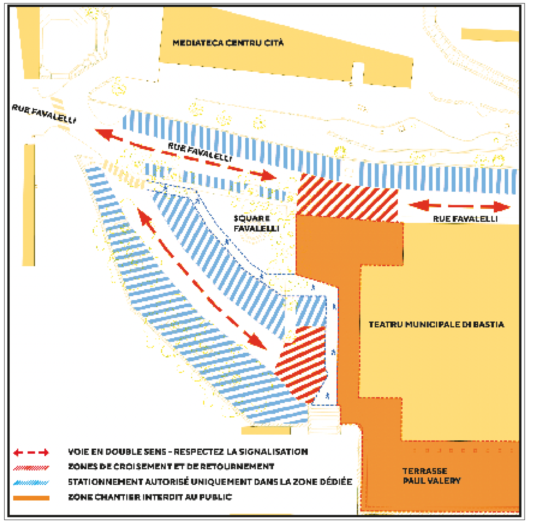 Cette phase de chantier implique un plan d’installation spécifique, nécessitant la neutralisation de la terrasse Paul Valery, destinée au stockage des installations, ainsi que de l’allée située devant l’entrée du théâtre (cf. zone en orange sur le plan). Le stationnement reste maintenu sur le reste de la zone, et les circulations piétonne et automobile pourront être adaptées ponctuellement.