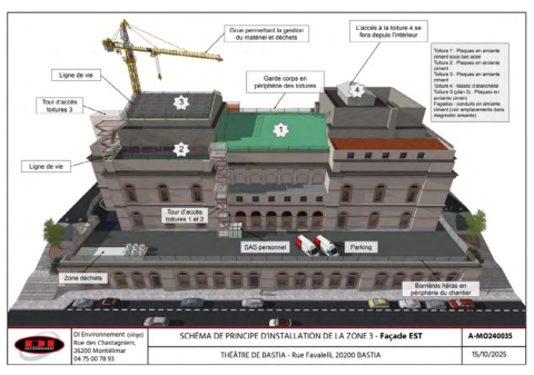 L’opération de désamiantage de la toiture du Théâtre de Bastia a été initiée fin décembre 2025 avec l’installation par l’entreprise DI Environnement de deux tours d’accès aux toitures (cf. plan).