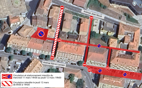 Par ailleurs, la circulation sera également interdite dans la rue du Docteur Gambini le jeudi 12 mars, entre 8 h et 19 h.Les autorités précisent que tout véhicule stationné dans ces zones sera retiré par la fourrière aux frais du propriétaire.Les résidents pourront toutefois accéder à leur domicile le jeudi 12 mars entre 8 h et 19 h, uniquement à pied et sur présentation obligatoire d’un justificatif de domicile ainsi que d’une pièce d’identité.