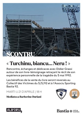 À partir de 18 heures, le public est invité à échanger avec Didier Grassi à l'occasion d'une rencontre-dédicace autour de son ouvrage intitulé « Turchinu, biancu... Neru ! ». À travers ce livre-témoignage, l'auteur replonge dans cette sombre soirée du 5 mai 1992, livrant le récit de son expérience personnelle lors de l'effondrement de la tribune Nord du stade Armand-Cesari. Un titre lourd de sens, rappelant comment les couleurs historiques de ferveur du Sporting se sont tragiquement assombries ce soir-là.