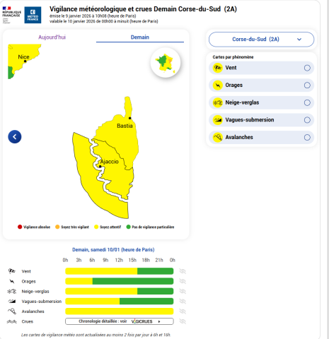 En Corse-du-Sud une vigilance jaune pour le paramètre vagues-submersion est également active de vendredi 9 janvier à 18h au samedi 10 janvier à 12h. Elle concerne plus particulièrement le sud-ouest de l’île notamment les golfes de Porto et de Sagone.